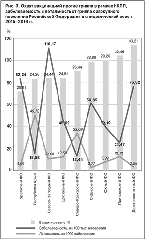 Заболеваемость гриппом и летальность от этой инфекции в сравнении с охватом вакцинацией в рамках НКПП населения Российской Федерации представлены на рис. 3 .