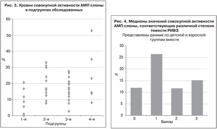 - Наибольшая активность АМП слюны имела место при легком течении РИВЗ (медиана 26%) и достоверно отличалась от таковой у здоровых добровольцев (медиана 11%) и пациентов со среднетяжелой и тяжелой формами РИВЗ (медианы 11 и 15%) (p ≤ 0,01).