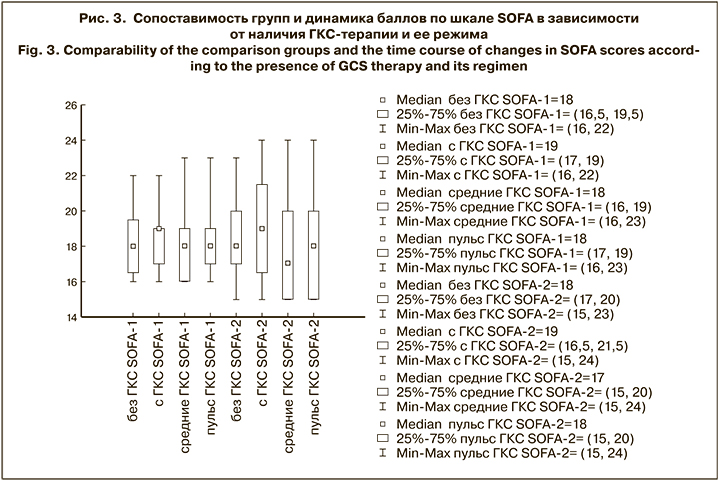 Для оценки целесообразности применения ГКС в комплексной терапии тяжелого лептоспироза определяли объективные критерии тяжести ПОН по шкале SOFA. Баллы SOFA-1 регистрировали при поступлении пациентов в стационар, а баллы SOFA-2 – на 2–3-й день пребывания. На рис. 3 показано, что вне зависимости от наличия ГКС-терапии и ее режима, медианы SOFA-2 с межквартильным интервалом статистически значимо не отличались ни в одной из групп.