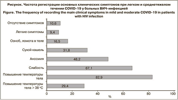 У 22 (25,9%) пациентов заболевание имело среднетяжелое течение (7 получали лечение в стационаре, 15 – амбулаторно); у 63 (74,1%) – легкое (60 лечились амбулаторно, 3 – в стационаре). 2 пациента заболели COVID-19 повторно (оба получали АРТ; количество CD4+-лимфоцитов – 450 и 545 клеток/мкл; РНК ВИЧ < 50 копий/мл). У одного 1-й эпизод протекал легко, 2-й имел среднетяжелое течение. Исследование мазка на РНК коронавируса из носоглотки методом ПЦР дало положительный результат, На КТ легких были выявлены изменения 2-й степени. У второго пациента 1-й эпизод имел среднетяжелое течение: была диагностирована пневмония, в сыворотке крови обнаружены анти-SARSCov-19 IgG в диагностических титрах; 2-й эпизод протекал легко, в мазке из носоглотки обнаружена РНК SARS-CoV-19, на КТ легких изменений не выявлено.