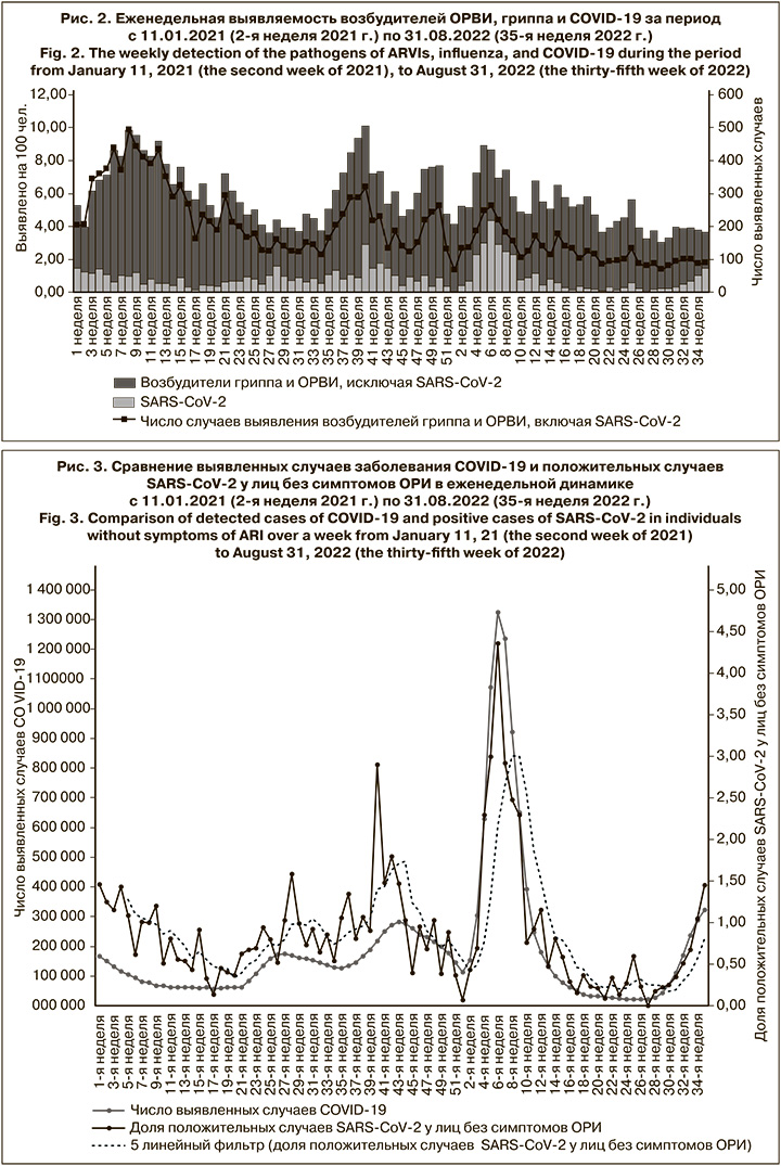 С 11.01.2021 по 31.08.2022 наблюдалось несколько пиков и периодов подъема частоты выявленных возбудителей в еженедельной динамике (рис. 2). Для эпидемического сезона 2020–2021 гг. характерна более плавная динамика обнаружения случаев инфицирования SARS-CoV-2 лиц без симптомов ОРИ с небольшим подъемом в зимний и летний периоды и снижением в апреле–мае 2021 г. В эпидемическом сезоне 2021–2022 гг. наблюдались несколько резких скачков числа выявленных случаев заражения SARS-CoV-2. Так, резкий подъем отмечался к 40-й неделе 2021 г. (11.10–15.10), однако далее в ноябре наблюдается спад числа инфицированных, что может быть связано с локдауном, введенным с 28.10 по 7.11.2021. Снижение числа выявленных случаев инфицирования сменилось новым подъемом в конце января 2022 г., продолжающимся в феврале, а затем резким спадом в марте. Динамика остальных возбудителей ОРВИ отличается от SARS-CoV-2: в сезоне 2020–2021 гг. максимальный уровень инфицированных вирусами ОРВИ наблюдался в марте на 8-й неделе 2021 г., с последующим постепенным снижением вплоть до конца сезона. Сезон 2021–2022 начался с повышения уровня инфицированности среди лиц без симптомов ОРИ на 35-й неделе 2021 г. (06.09–10.09.2021), сменившегося краткосрочным спадом на 42–45-й неделях. Следующий подъем отмечался в декабре (48-я неделя 2021 г.), прерываясь спадом в новогодние праздники, и возобновился с конца января (4-я неделя 2022 г.), сменяясь в марте постепенным снижением числа обнаруженных случаев инфицирования возбудителями ОРВИ.