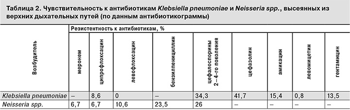 Ожидаемо неутешительные результаты были получены при анализе чувствительности к антибиотикам Klebsiella pneumoniaе, выделенной у 39 детей и взрослых. Этот возбудитель сохраняет полную чувствительность к фторхинолонам 2-го поколения, в то же время резистентность к ципрофлоксацину составляет уже 10%, а к цефалоспоринам – до 40%. Такие же настораживающие результаты были получены при анализе чувствительности к антибиотикам Neisseria spp., выделенной из верхних дыхательных путей у 60 детей и взрослых. Оказалось, что наименее чувствителен этот возбудитель к бензилпенициллину и цефалоспоринам 2–4-го поколения (резистентность – 23 и 26% соответственно), что, возможно, требует пересмотра эмпирической терапии при подозрении на менингококковую инфекцию (табл. 2).