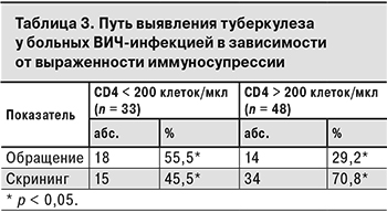 На момент выявления туберкулеза сведения об иммунном статусе имелись только у 81 (74,3%) больного ВИЧ-инфекцией. В зависимости от выраженности иммунодефицита пациенты были разделены на 2 группы: 48 (59,25%) больных с концентрацией CD4-лимфоцитов > 200 клеток/мкл и 33 (40,75%) – с концентрацией < 200 клеток/мкл. Важно отметить, что больных без выраженного иммунодефицита было больше, чем лиц с глубокой иммуносупрессией. Мы попытались выявить наличие связи между степенью иммуносупрессии и способом выявления туберкулеза. Как и предполагалось, среди пациентов с относительно сохранным иммунитетом большинство (70,8%) были выявлены по ФЛГ-скринингу, а в группе пациентов с концентрацией CD4-лимфоцитов < 200 клеток/мкл – только 45,5% (р < 0,05; табл. 3).