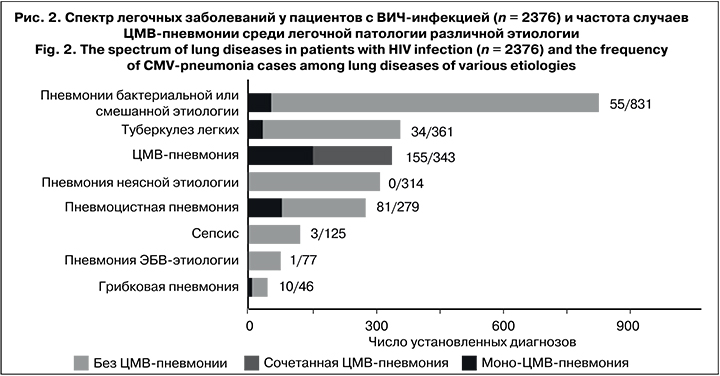 ЦМВ-пневмония определена как единственная причина легочной патологии у 188 (54,8%) больных; при сочетанном поражении легких наиболее часто имели место пневмоцистная пневмония – 81 случай (23,6% среди пациентов с ЦМВИ), бактериальная пневмония – 55 (16%), туберкулез легких – 34 (9,9%).