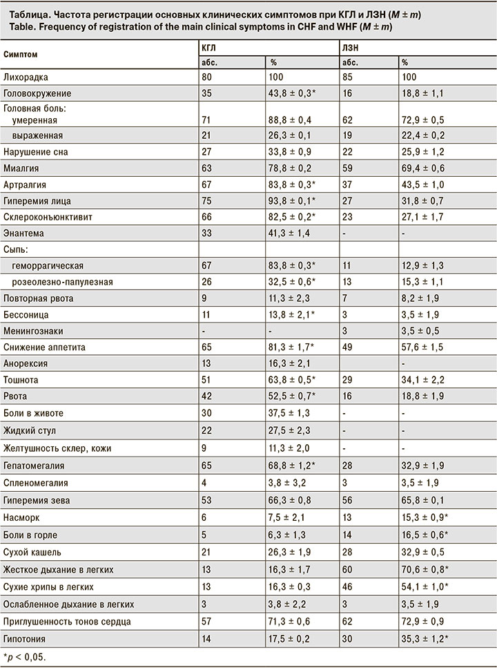 Результаты. КГЛ регистрируют преимущественно в мае–июне (76,7%), ЛЗН – с августа по сентябрь (87,3%). При КГЛ в 51,6% случаев был установлен контакт с клещом, 71,8% больных ЛНЗ отмечали множественные укусы комаров. Для КГЛ, в отличие от ЛЗН, характерны выраженный синдром интоксикации (77,5% случаев), высокая и чрезмерная лихорадка, «двугорбая» температурная кривая (33,3%), общемозговые симптомы, геморрагическая сыпь (83,8%), бесполостные (58,8%) и полостные (28,8%) кровотечения. Гепатомегалия встречалась вдвое чаще, чем при ЛЗН – в 68,8 и 32,9% случаев соответственно (р < 0,05). Тромбоцитопения при КГЛ проявлялась у 92,5% больных, при ЛЗН – у 37,2%. При ЛЗН чаще отмечали катаральный синдром, высокую лихорадку (68,2%) и наличие «постоянной» температурной кривой (62,7%),высыпания на коже в виде розеолезно-папулезной сыпи (15,3%).