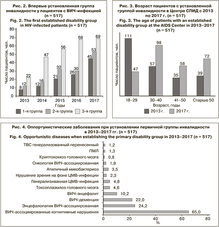 Приведен ретроспективный анализ историй болезни и амбулаторных карт 517 пациентов (291 мужчина и 226 женщин) с подтвержденной ВИЧ-инфекцией и установленной группой инвалидности, состоящих на диспансерном учете в Центре по профилактике и борьбе со СПИД и инфекционными заболеваниями г. Санкт-Петербурга (далее – Центр СПИД) в период 2013–2017 гг. Из 242 больных, впервые обратившихся для оформления группы инвалидности в 2013 г., 111 чел. были молодыми людьми в возрасте от 18 до 29 лет. Основной причиной установления группы инвалидности были сопутствующие заболевания, возникшие как осложнения на фоне приема психоактивных веществ. В 2017 г. в связи с длительно текущей ВИЧ-инфекцией, нарушением приема АРТ, поздним обращением за медицинской помощью выросло число больных в более старших возрастных группах и инвалидность назначалась в связи осложнениями самой ВИЧ-инфекции.